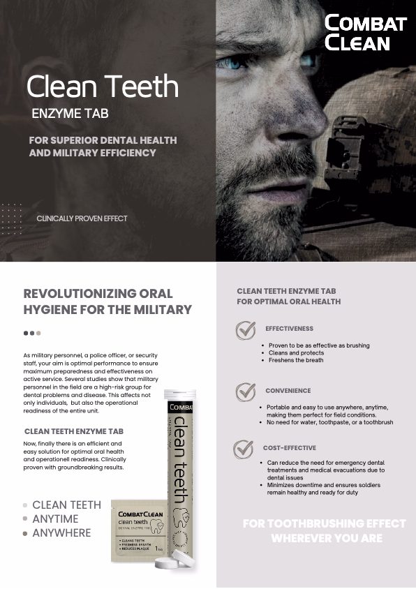 Endlich gibt es eine effiziente und einfache Lösung für optimale Mundhygiene und dauerhafte Einsatzbereitschaft. Klinisch erwiesen und mit bahnbrechenden Ergebnissen: Die Clean Teeth Dental Enzyme Tabs tragen effektiv und mühelos zu gesunden Zähnen, frischem Atem und allgemeinem Wohlbefinden bei – selbst unter schwierigsten Einsatzbedingungen.