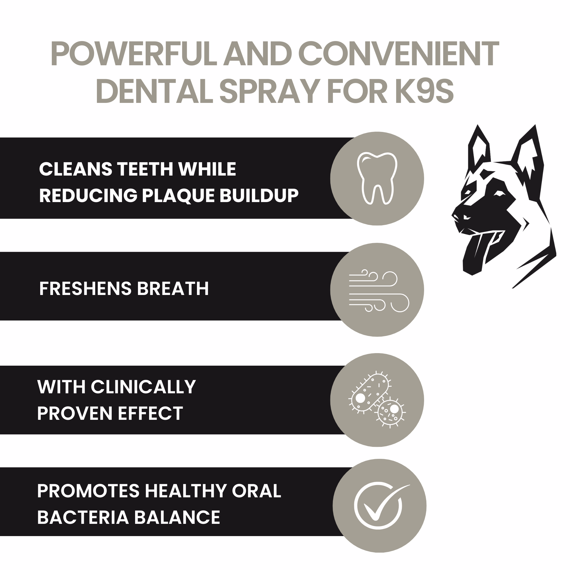 Der K9 Dental Spray revolutioniert die Zahnpflege Ihres Hundes. Statt mechanischer Reibung setzen wir auf die Kraft der Wissenschaft, um die Mundgesundheit Ihres Tieres effektiv zu verbessern – ganz einfach aufgesprüht!