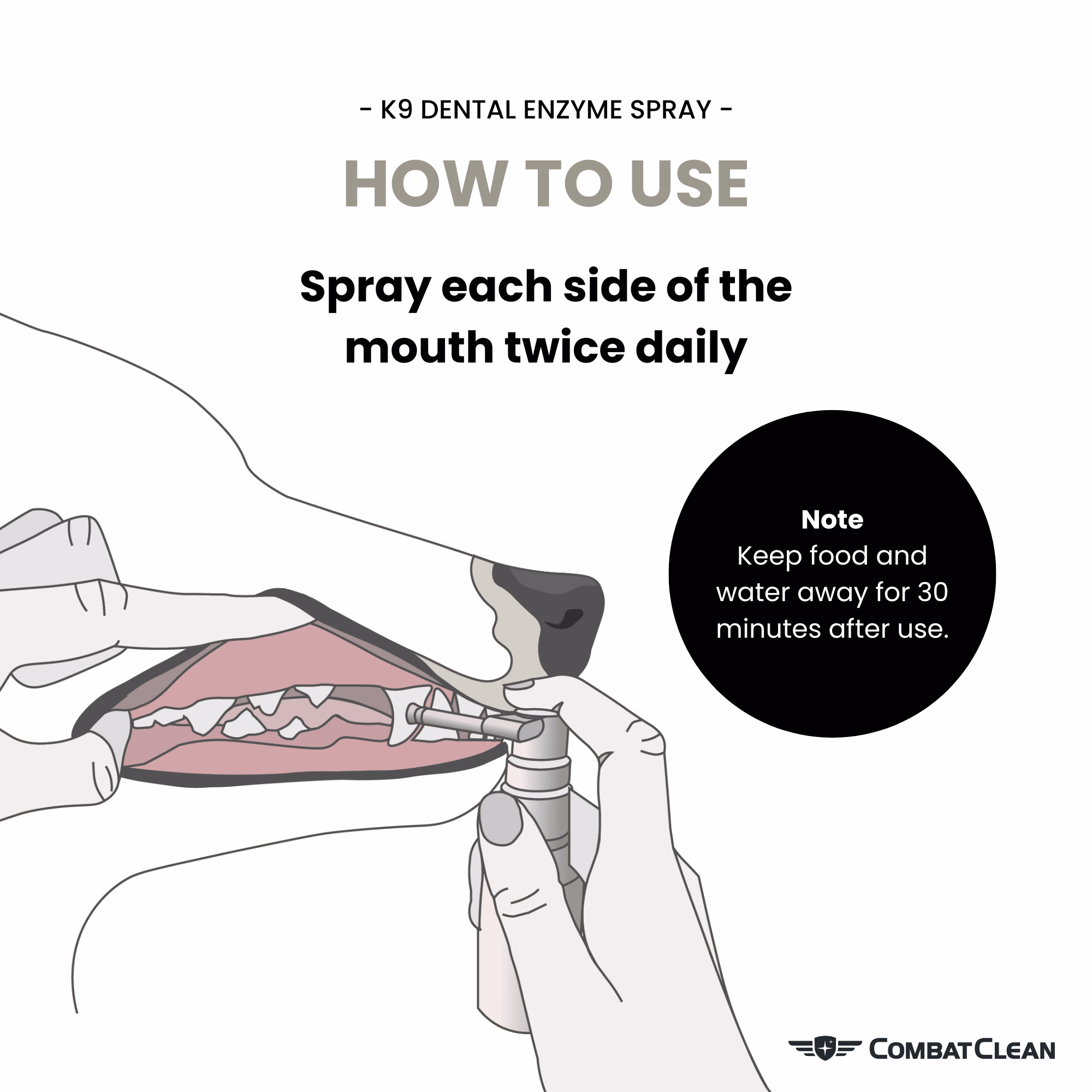 Zweimal täglich je zwei Sprühstöße pro Seite auf Zähne und Zahnfleisch sprühen. Danach 30 Minuten kein Futter oder Wasser.