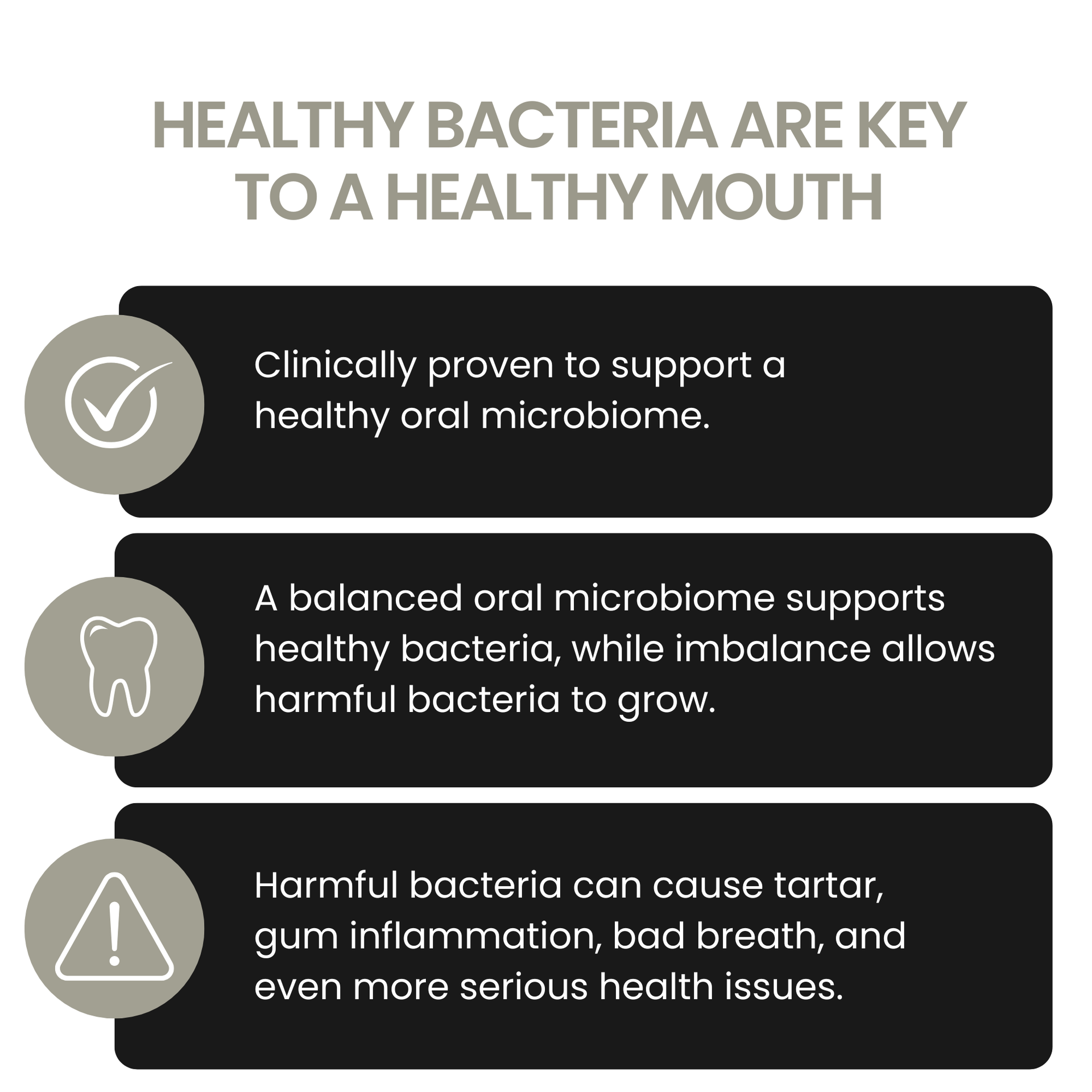 • Starke Abwehr: Es entsteht eine starke, gesunde Abwehr gegen die Bakterien, die sonst Plaque, Zahnstein und hartnäckigen Mundgeruch (Halitosis) verursachen. Das ist die sanfte, aber wirksame Alternative zum täglichen Zähneputzen.