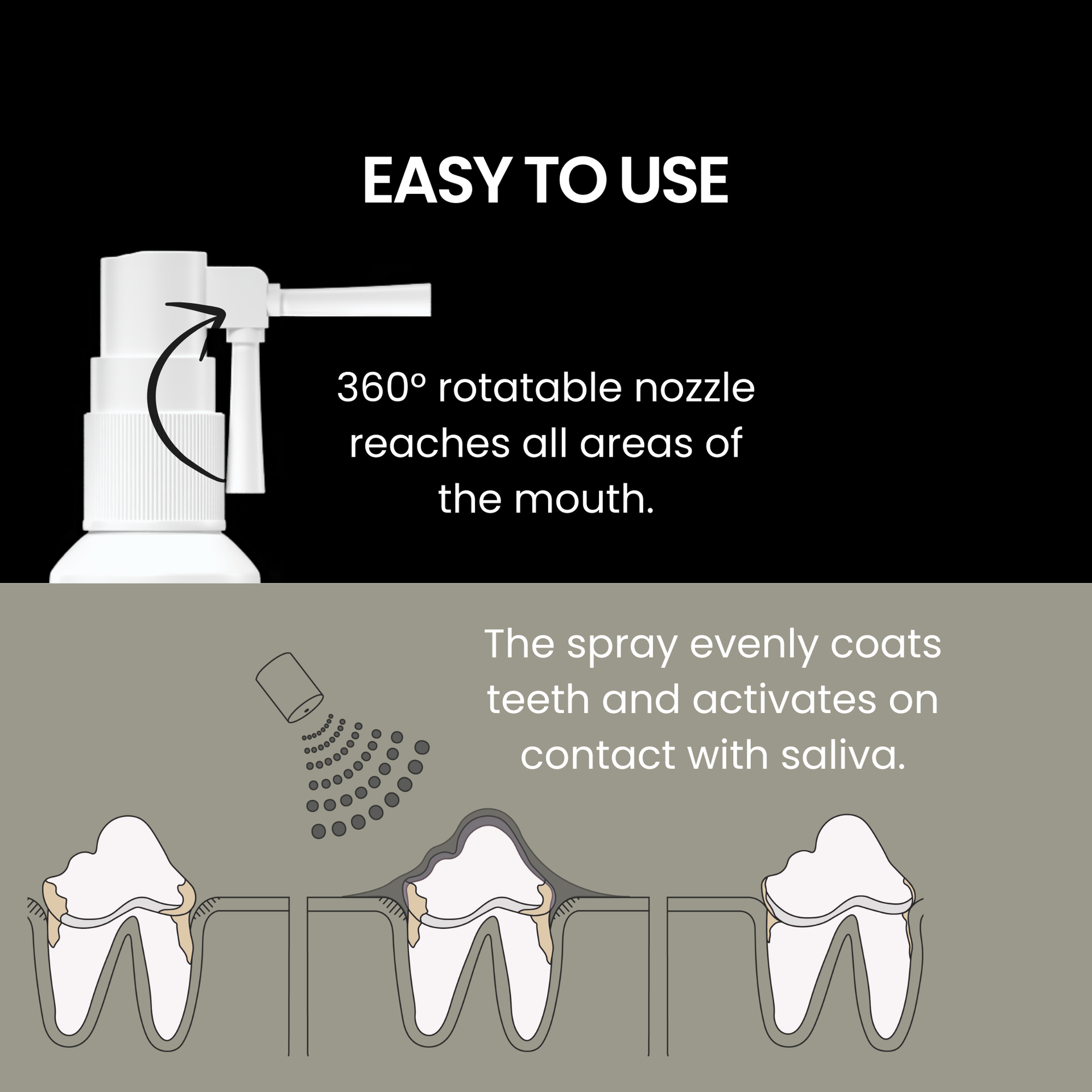 • Aktiver Schutzschild: Dank der einzigartigen hydrolytischen Enzyme von Kalzyme™ bildet unser Zahnspray eine aktive, unsichtbare Schutzbarriere auf Zähnen und Zahnfleisch.